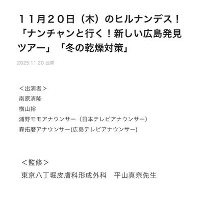 2025年11月20日、日本テレビ「ヒルナンデス!」より取材依頼を受け、〝乾燥対策〟について平山真奈先生が本企画の監修を務めさせていただきました。