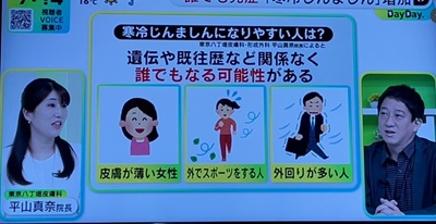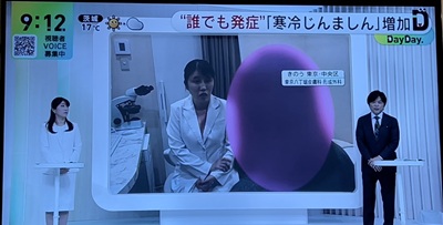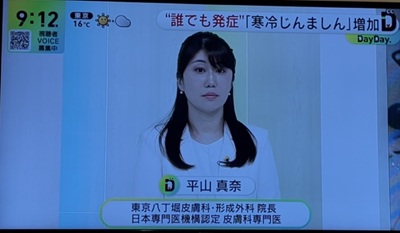 2025年11月27日、日本テレビ「DayDay.」より取材依頼を受け、〝寒冷蕁麻疹〟について平山真奈先生が演者としてスタジオ出演、またインタビュー出演もさせていただきました。