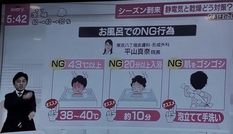 2025年12月2日、日本テレビ「news every.」より取材依頼を受け、平山真奈先生がインタビュー出演しました。〝静電気と乾燥対策〟についてお話させていただきました。